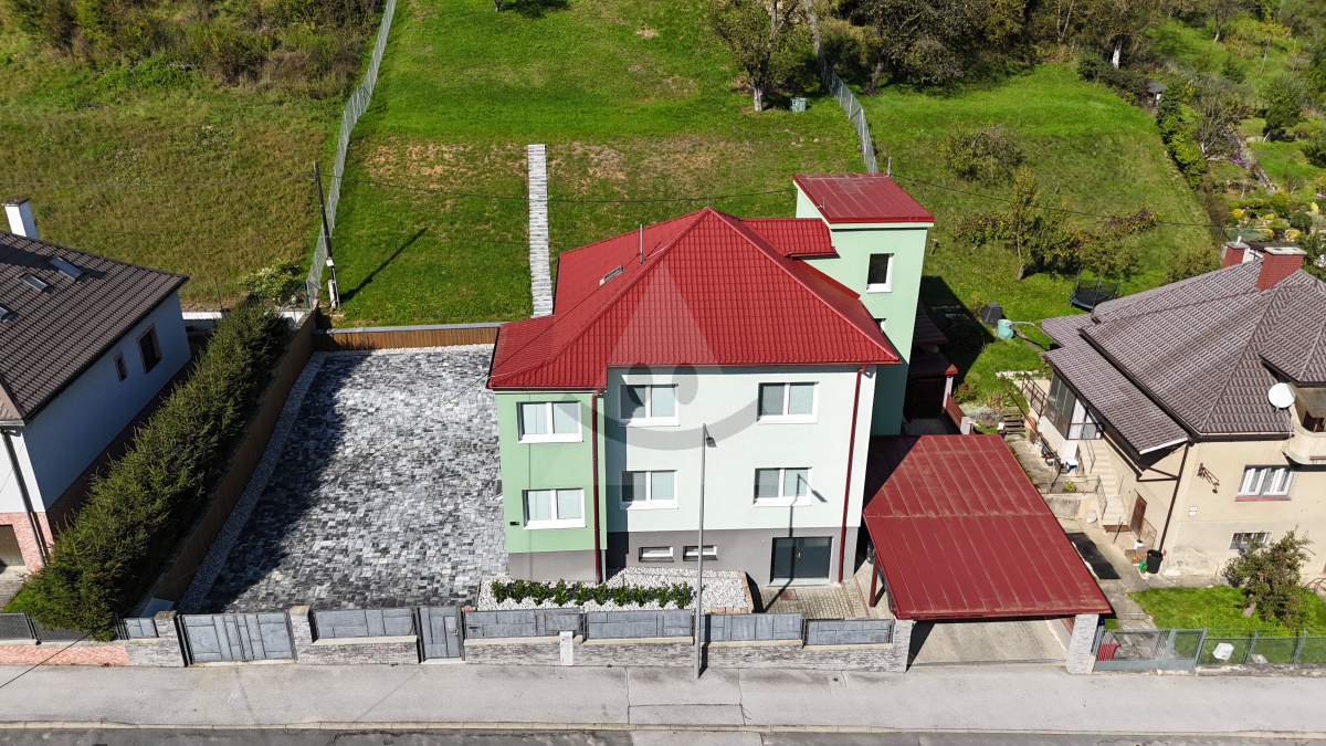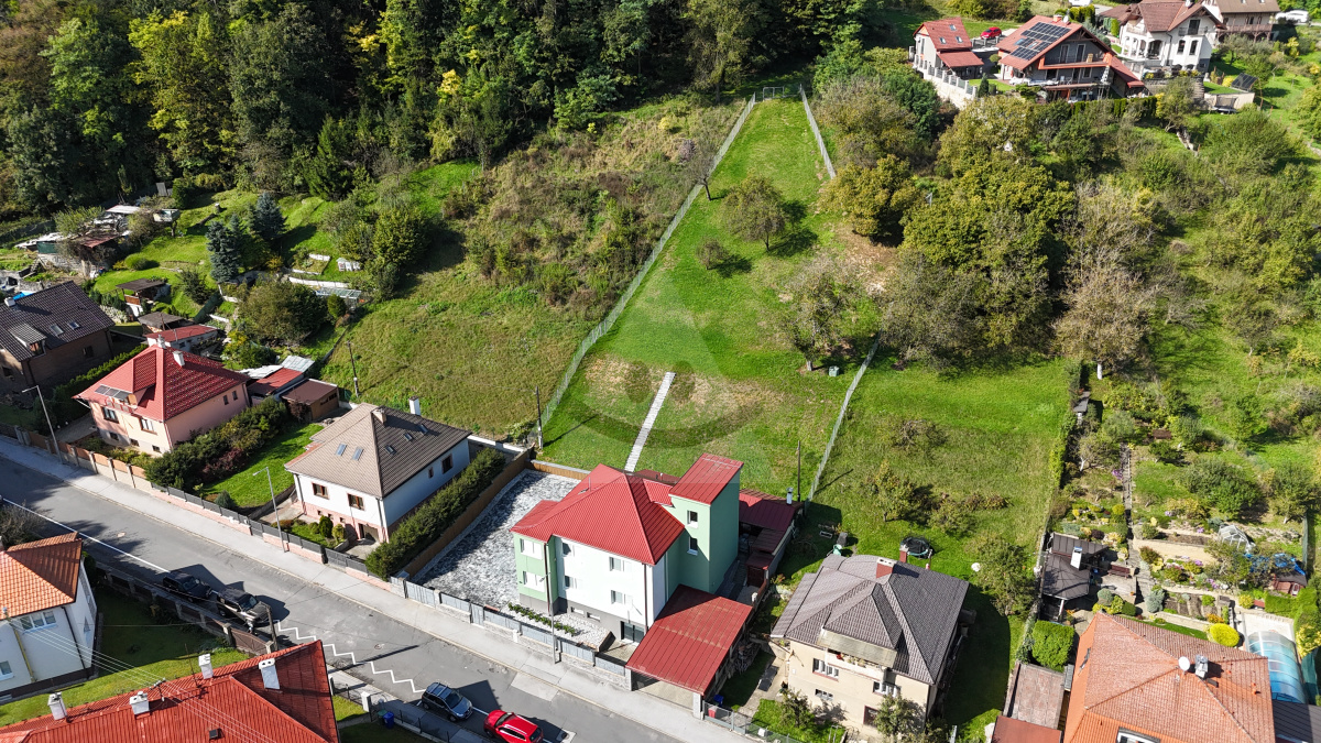 Dom stojí na celkovej výmere 2242 m2, pričom záhradu o rozlohe 1808 m2 tvorí svahovitý terén. Exteriér domu dopĺňa záhradný domček a prístrešok na dve autá, s ovládacou výklopnou bránou. Ďalšie možnosti parkovania ponúka spevnená plocha pre 4-5 áut.