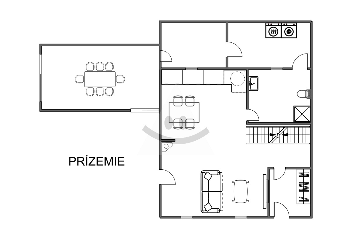 Prístavba s rozlohou 100 m2 ponúka posedenie s možnosťou uzavretia v prípade nepriaznivého počasia a parkovacie miesto pre dve autá